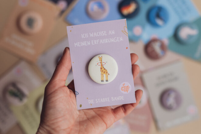 Dieser liebevoll gestaltete 38 mm Button ist mehr als nur ein Accessoire: Er ist ein täglicher Begleiter, der Kinder stärkt und ihnen ein gutes Gefühl mitgibt. In Kombination mit einem passenden A7 Kärtchen mit Affirmation entsteht ein kleines, bedeutungsvolles Geschenk, das bleibt.