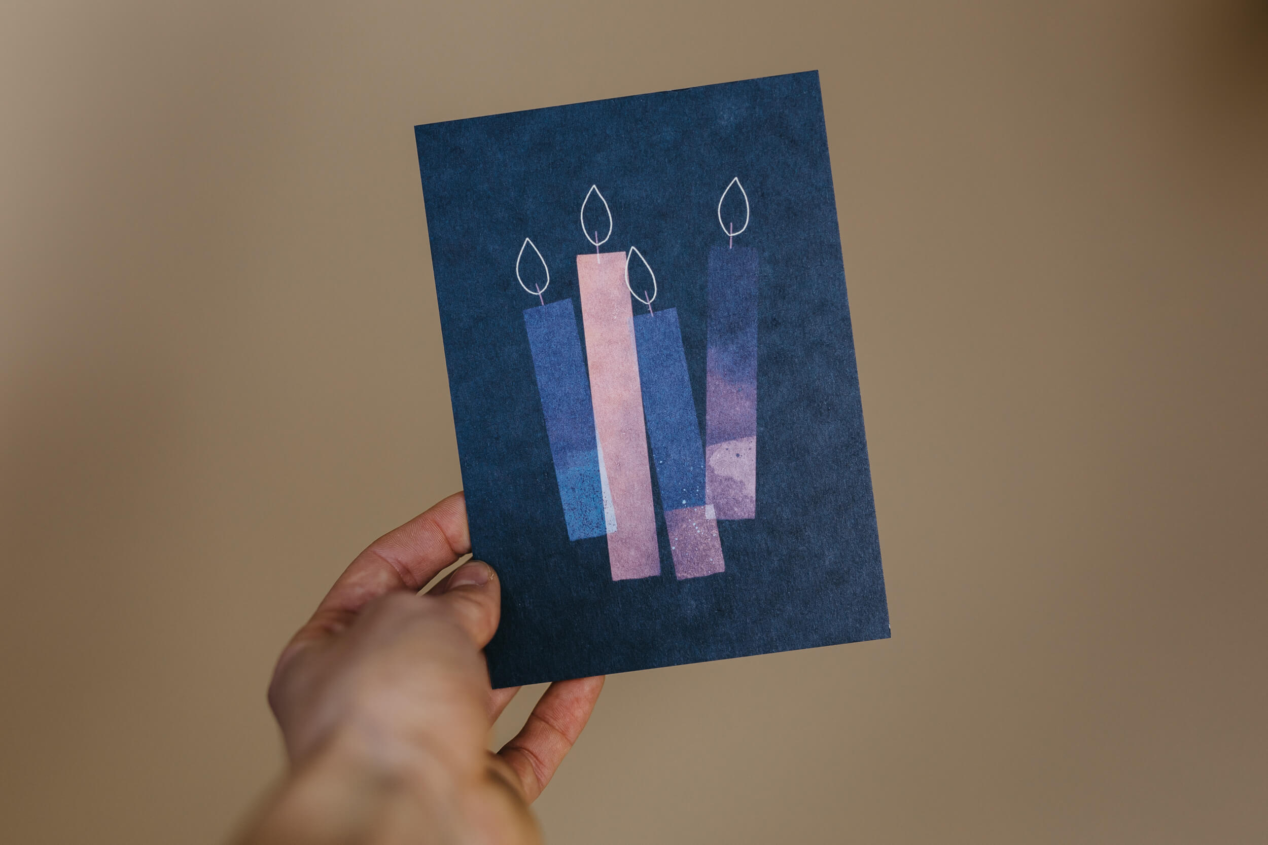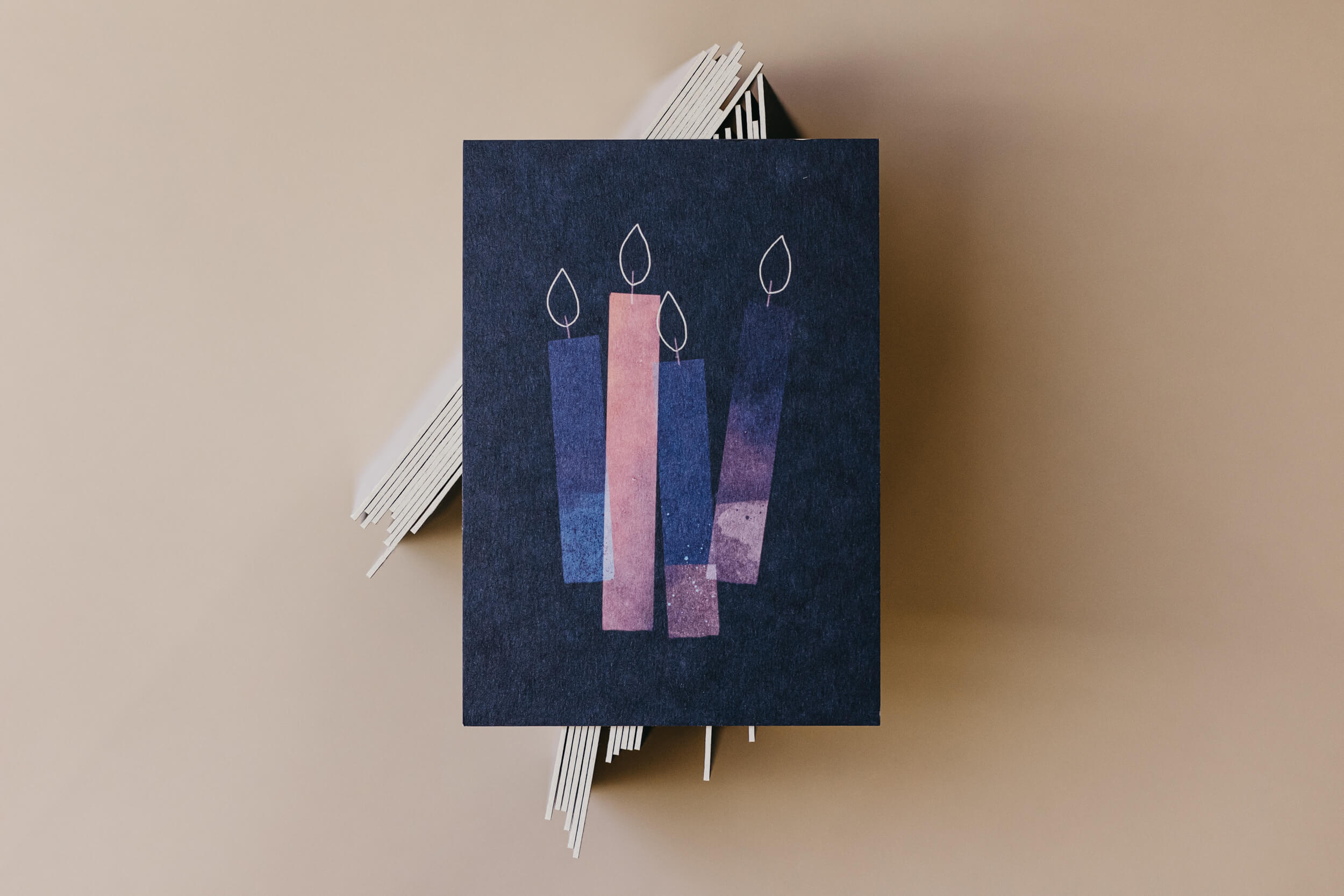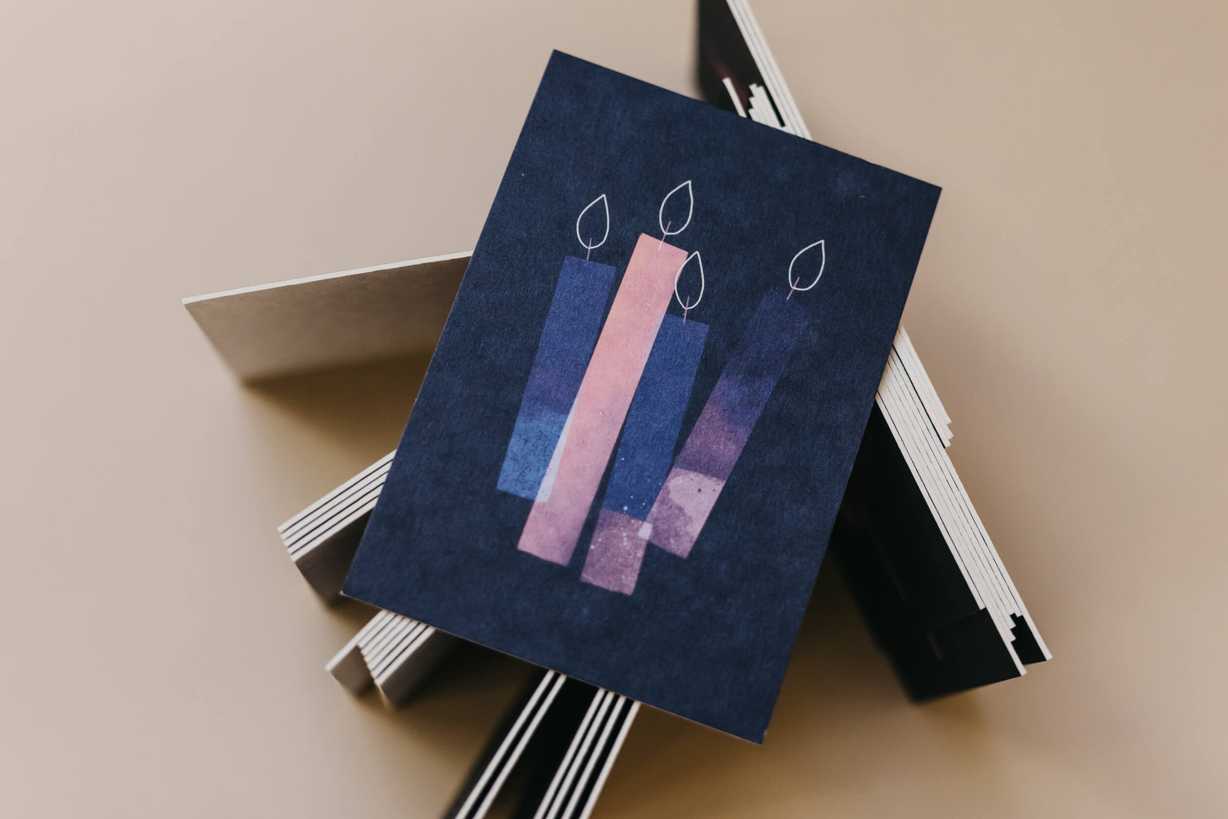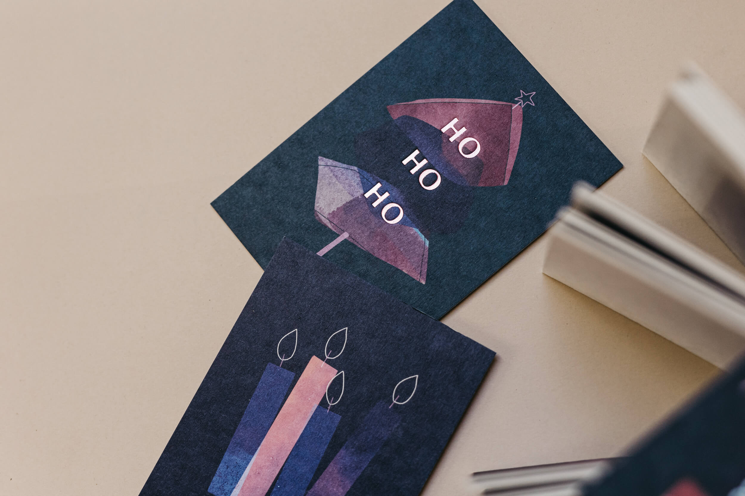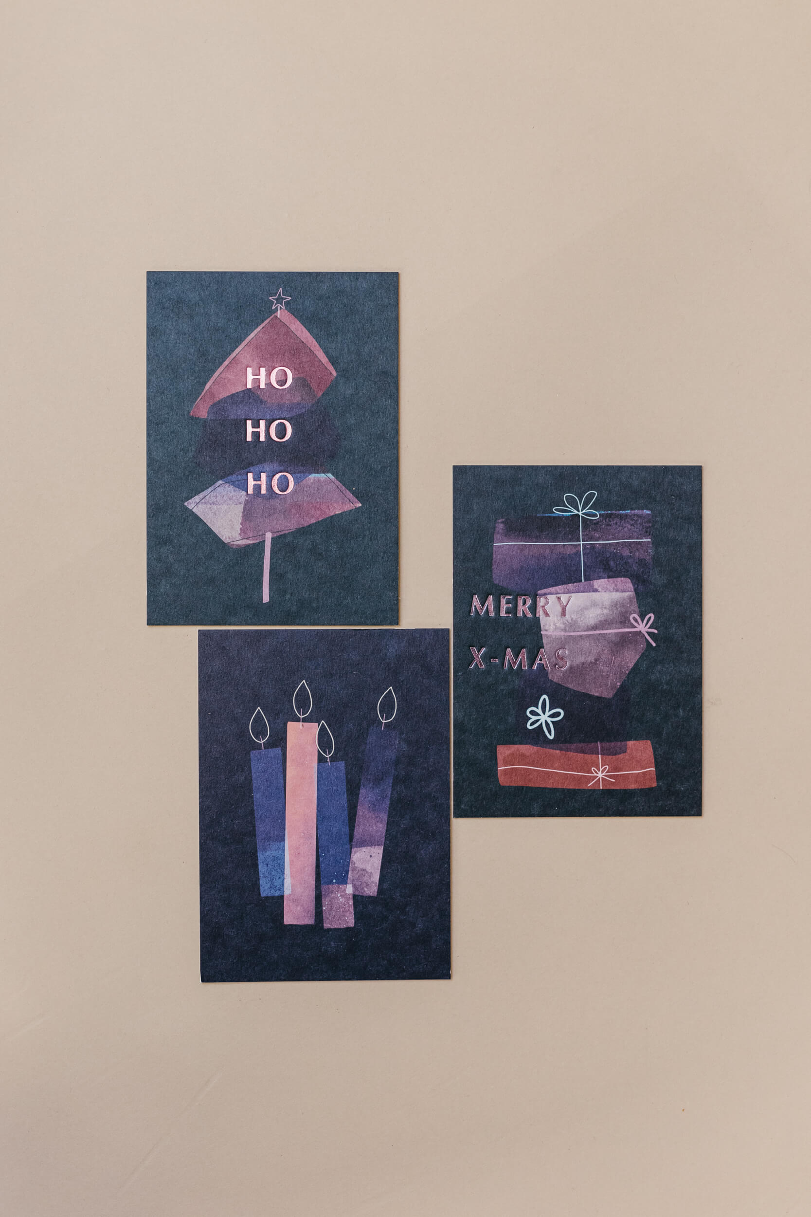 Ein edler Weihnachtsgruß mit abstraktem Design mit geprägtem Schriftzug auf extra dicker Holzschilfpappe.